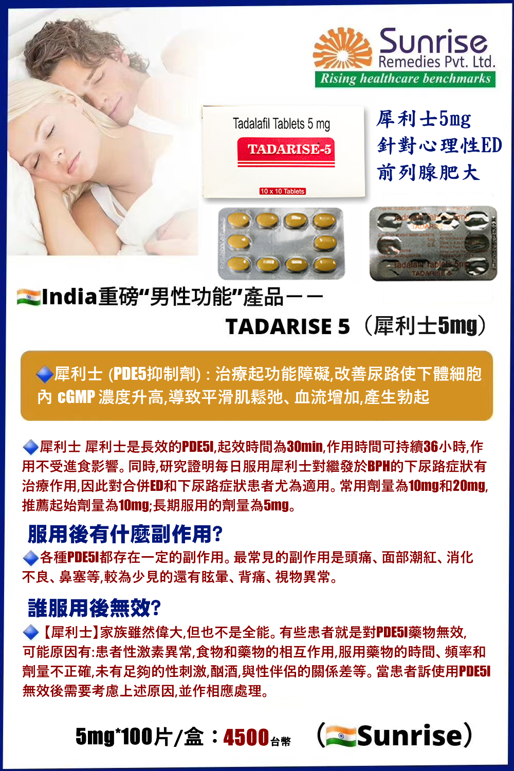 【注意事項】:劑量5mg非常低,基本上是針對陽痿患者長期修護治療用,目前沒什麼需要注意的事項,副作用也輕到幾乎感覺不出